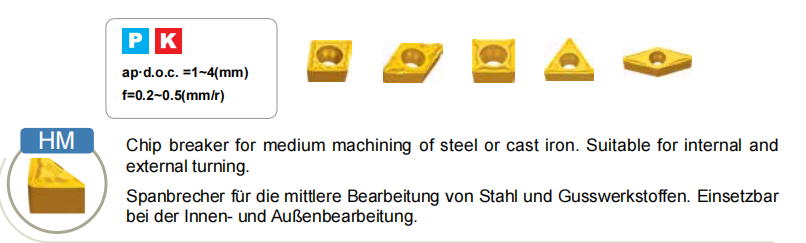 HM:Chip breaker for medium machining of steel or cast iron. Suitable for internal and external turning.